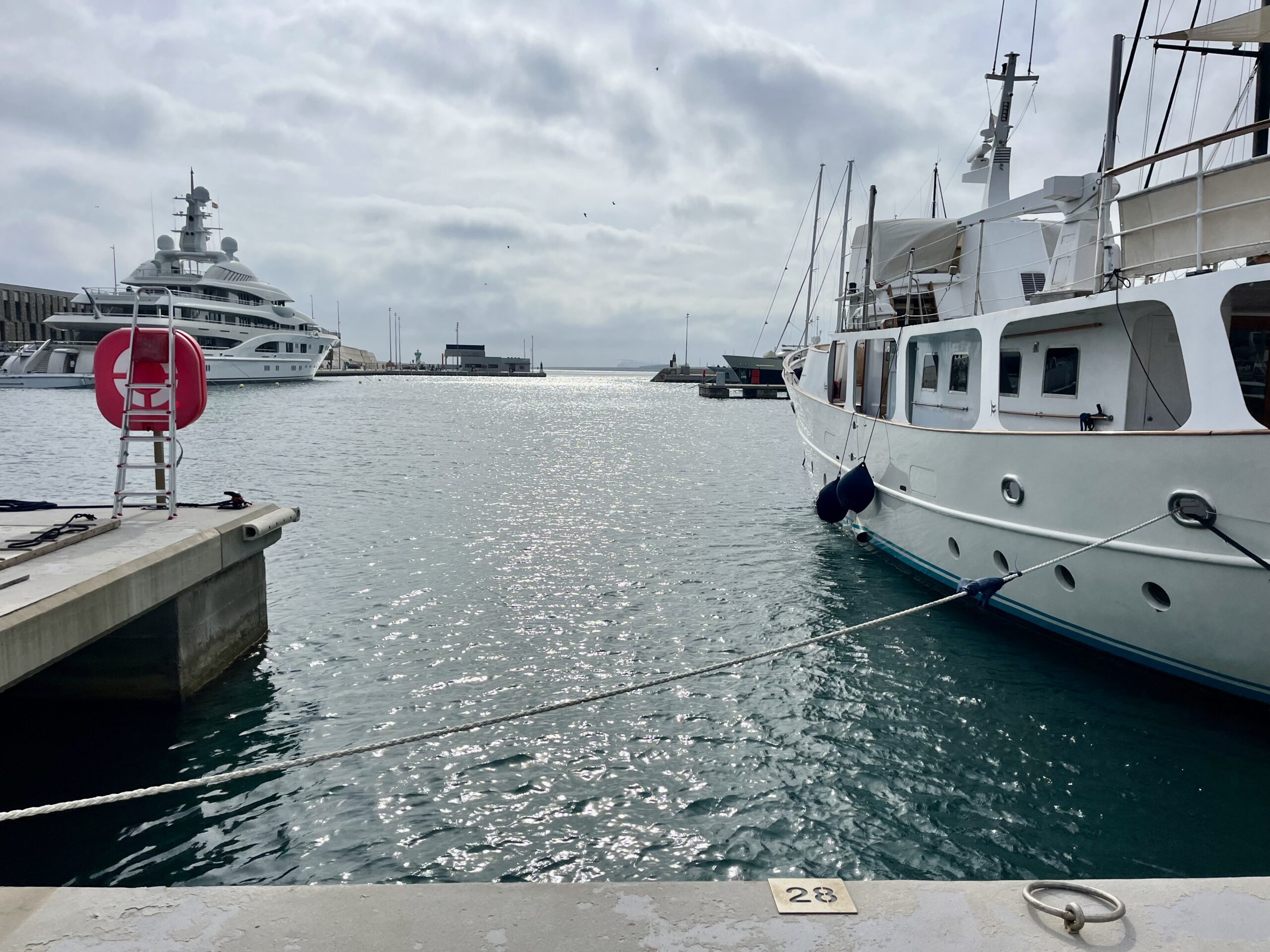 Facing W Hotel and Centre Port. Alongside and stern to mooring. Super easy to maneuver in and out of the mooring, plus lots space behind and on the side of mooring (T pontoon) and wide-open views of the port and Barcelona — the ultimate yachting destination